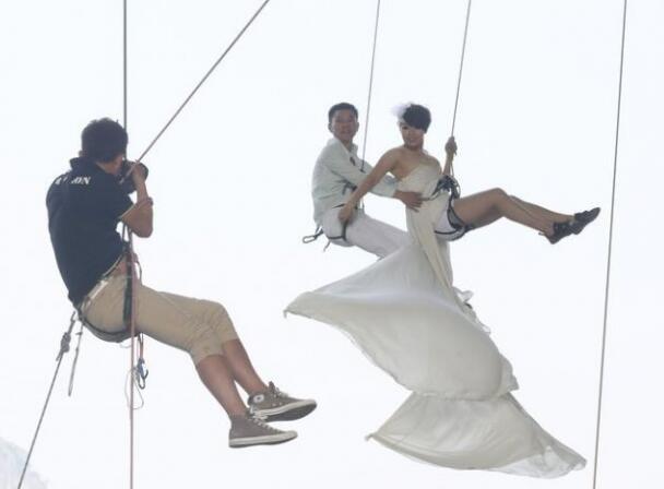 女汉子”穿婚纱攀岩 拍摄酷炫拽婚纱照