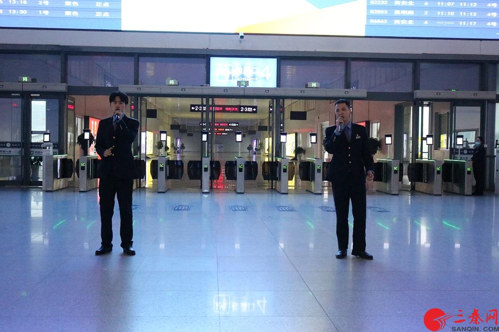 踏着乐音,车站工作人员热情放歌《西成高铁》,从各个角落向二楼候车室齐聚。